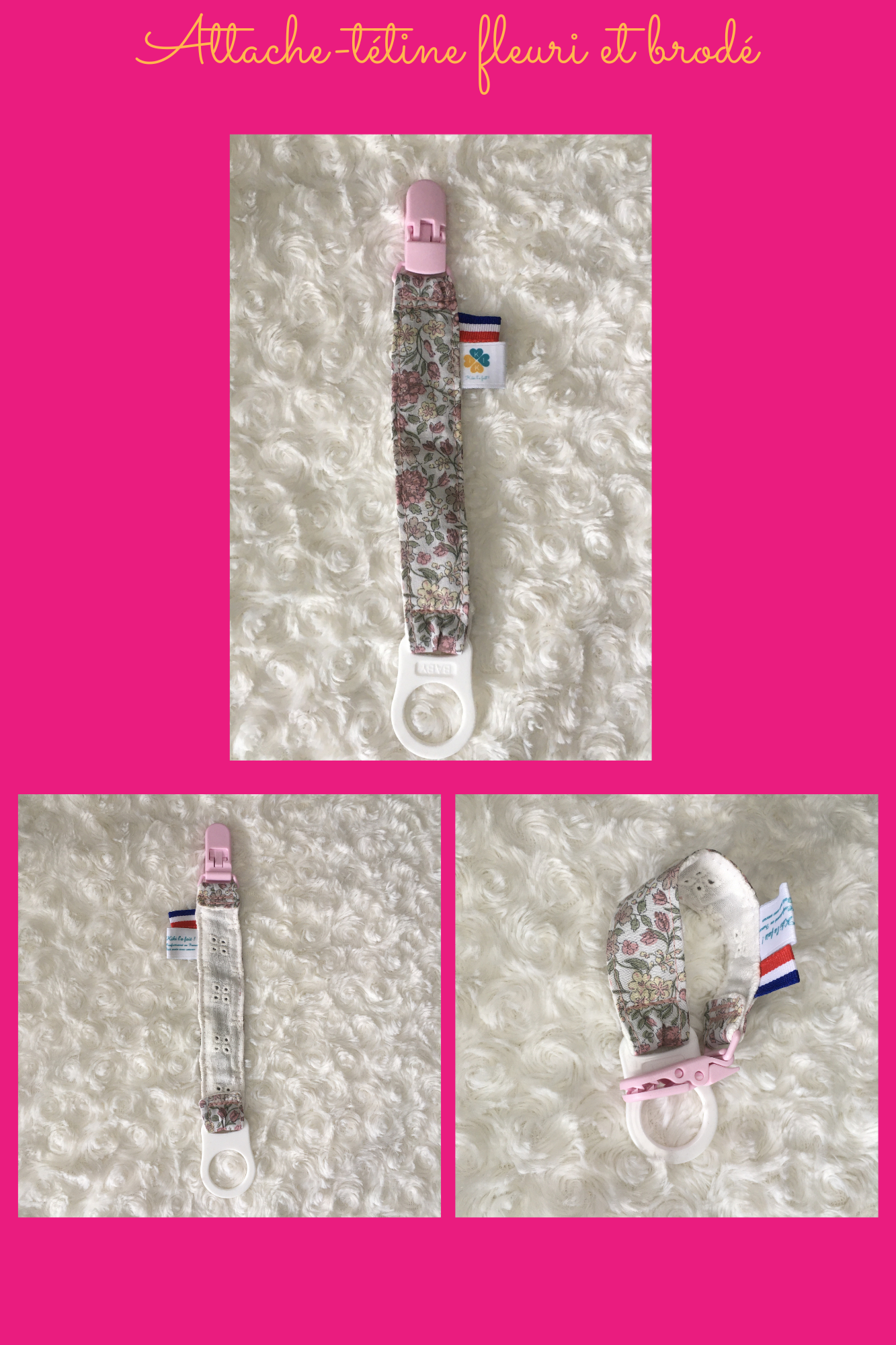 Attache-tétine en popeline de coton bio fleurie. Envers double gaze de coton brodé, certifié oeko-tex .