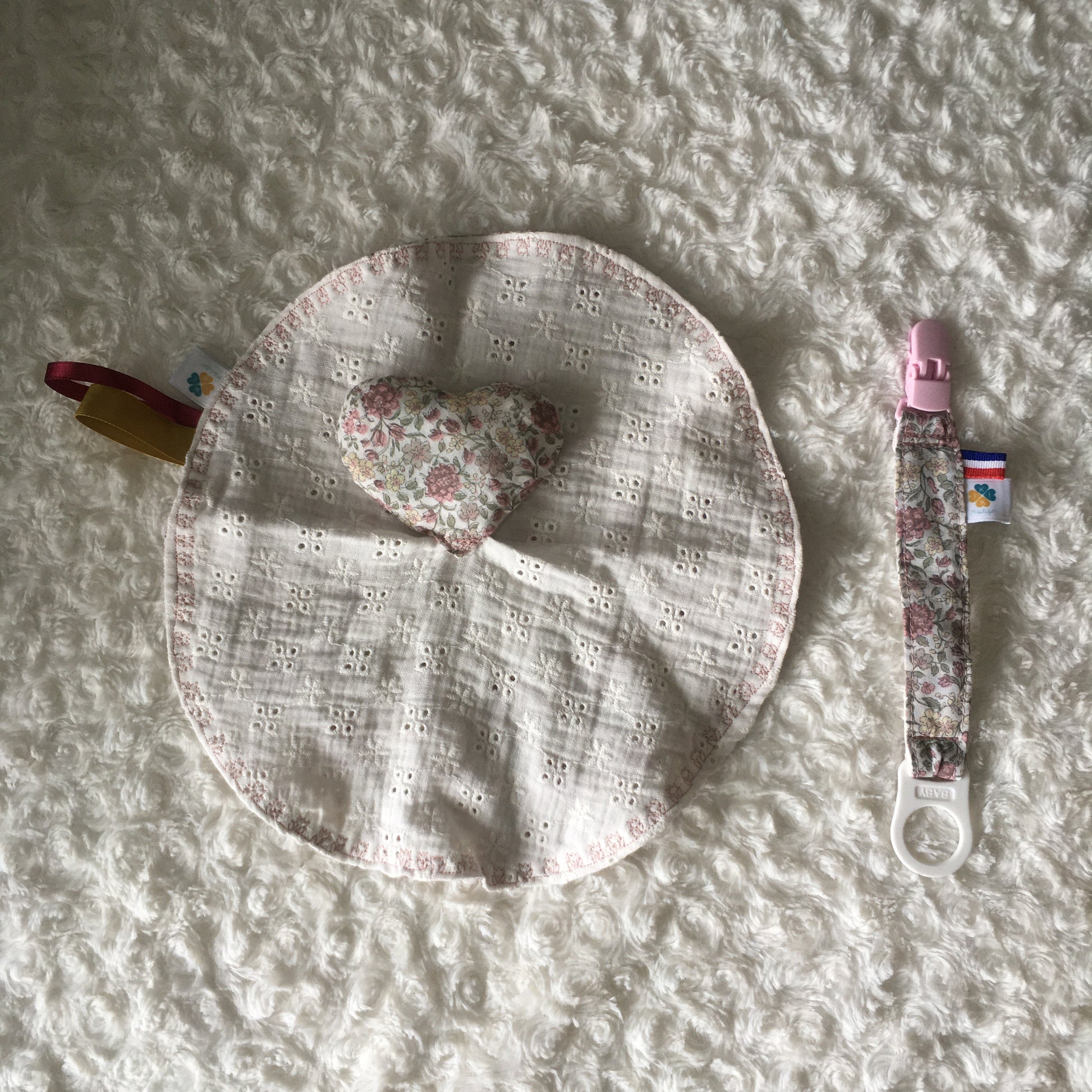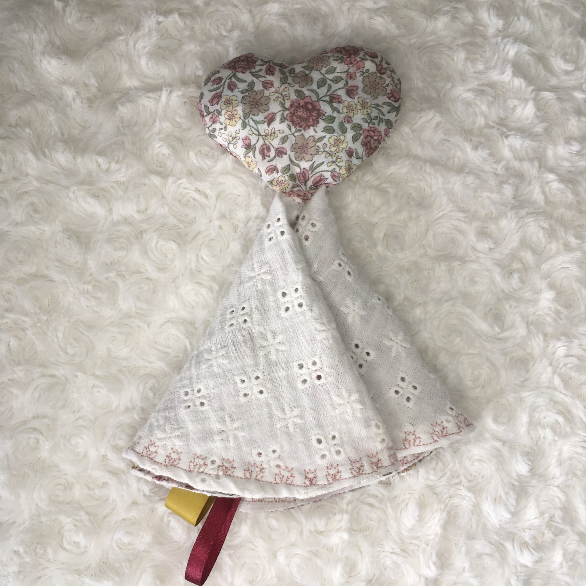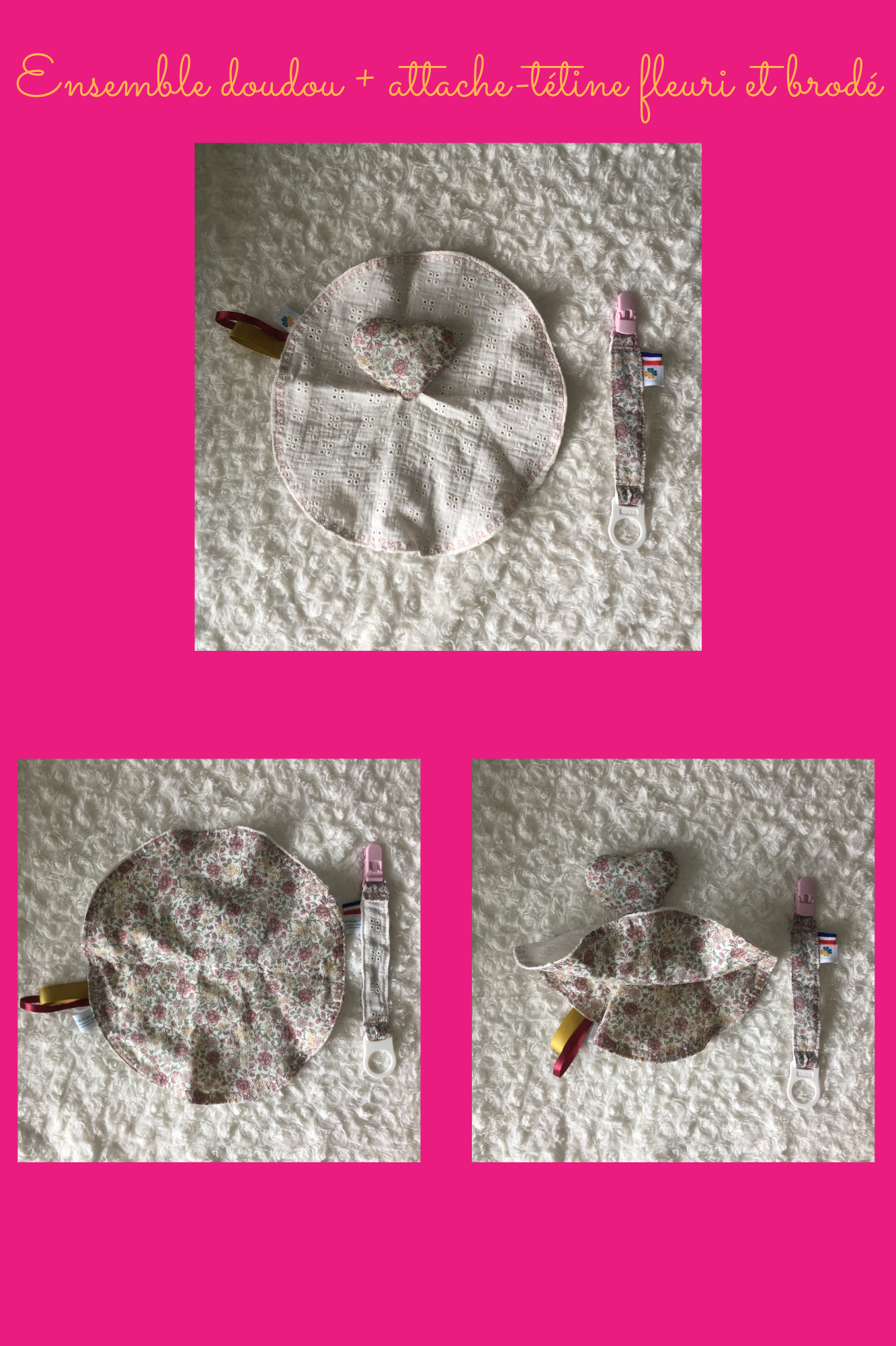Ensemble doudou coeur + attache-tétine fleuri et brodé