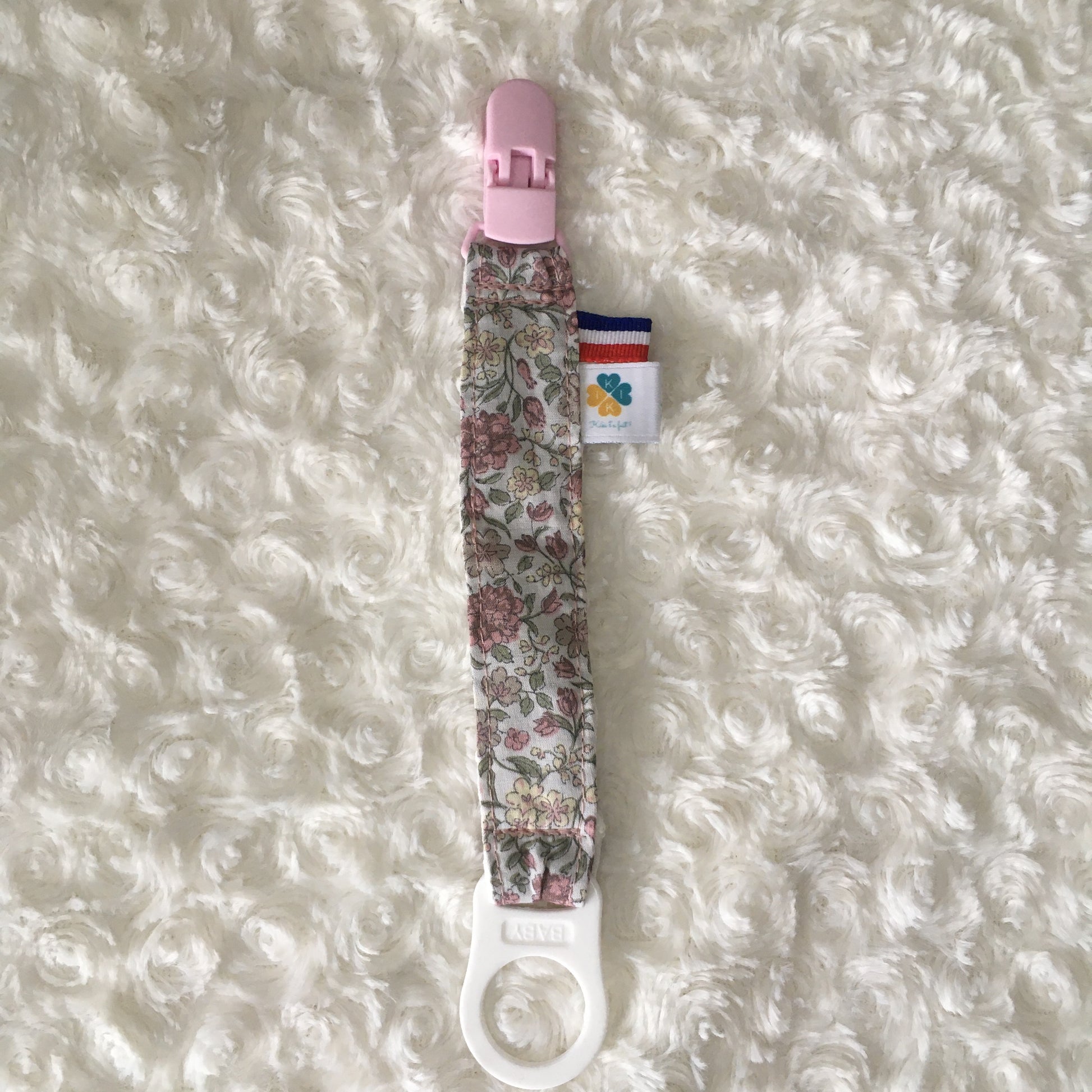 Attache-tétine en popeline de coton bio fleurie. Envers double gaze de coton brodé, certifié oeko-tex .
