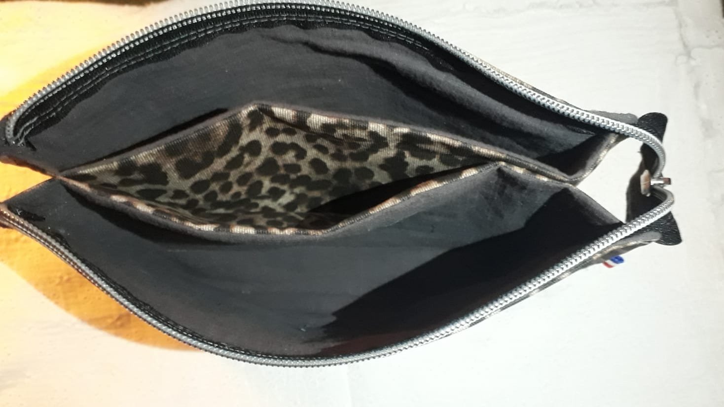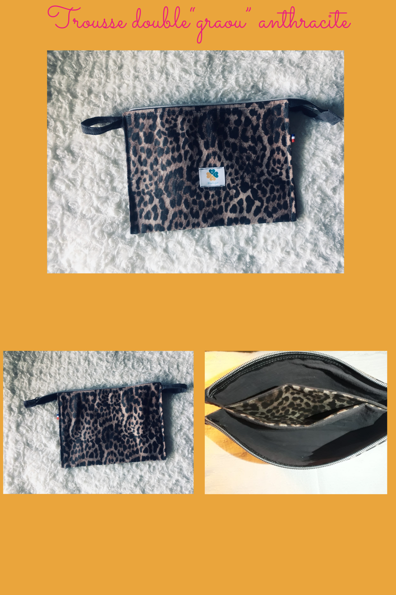 Trousse double en toile enduite, "léopard", doublure en gaze de coton anthracite.